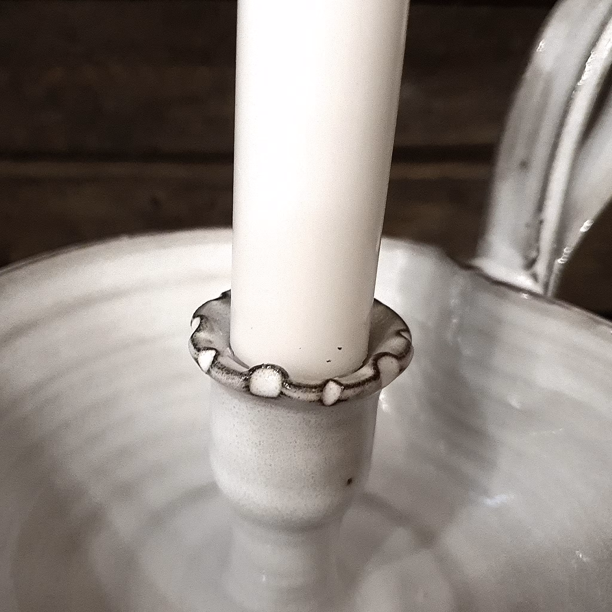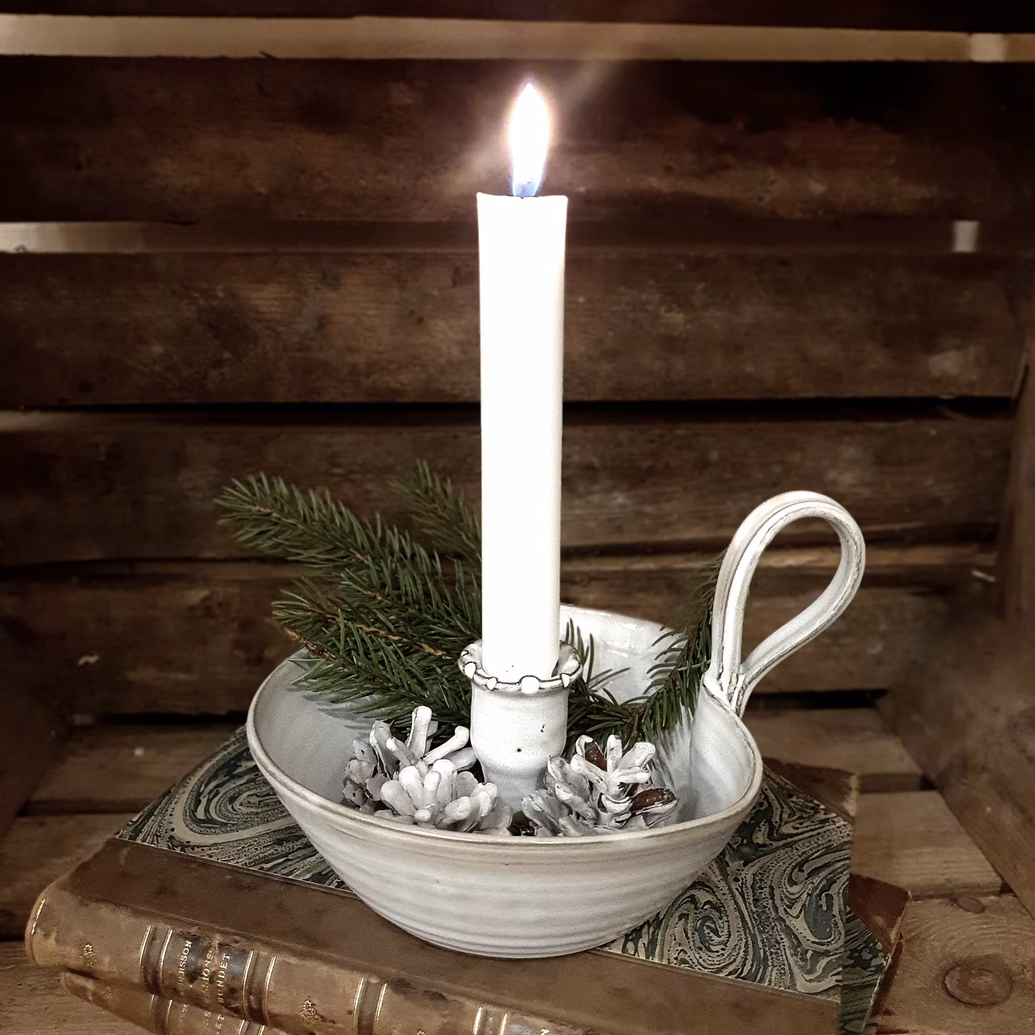 Traditionell kammarljusstake med ett dekorativt handtag. Trevlig att fylla med blommor, fina stenar, mossa till jul, kottar, vackra strandfynd eller något annat fint. Finns många möjligheter året runt. Hållaren är lagom till ett kronljus.
