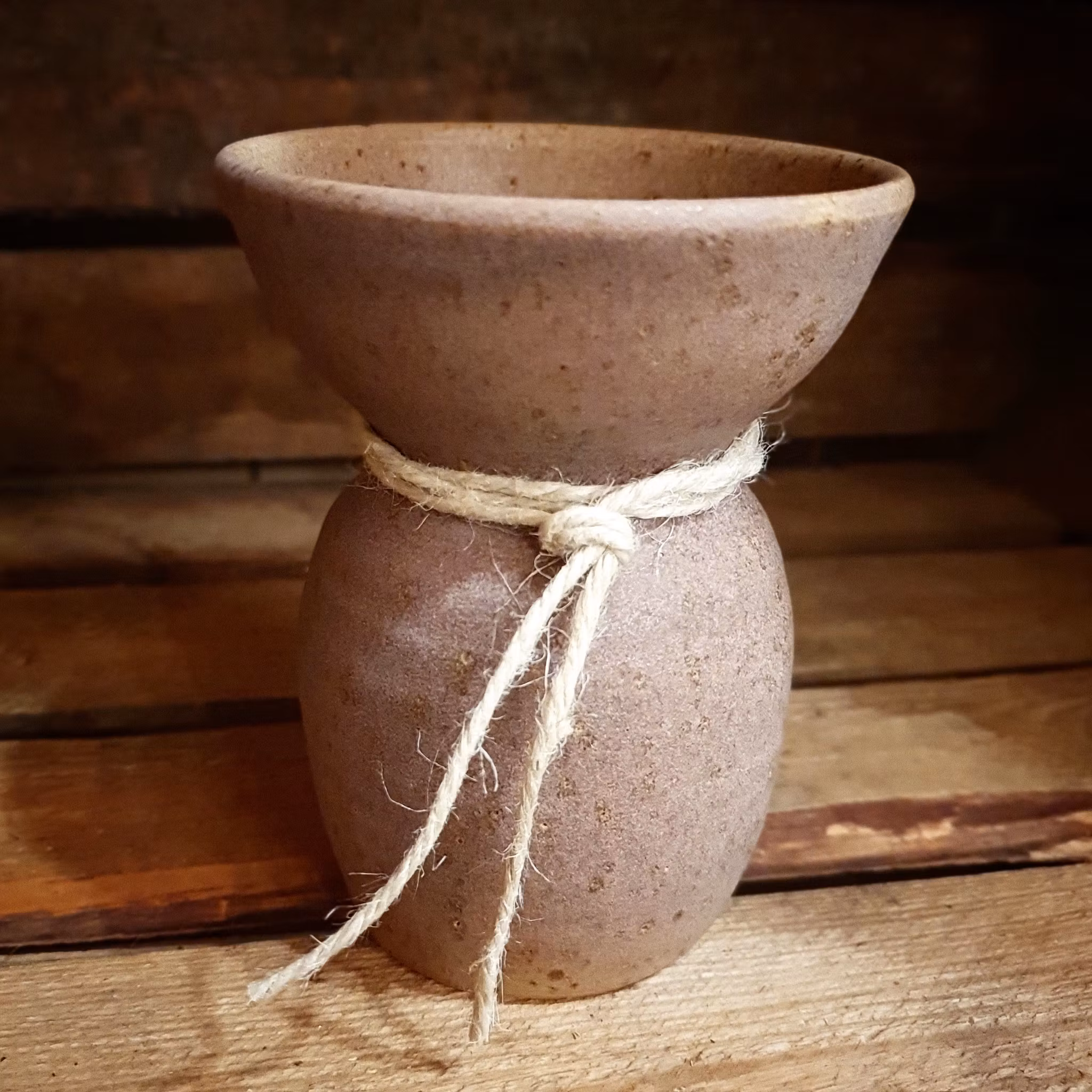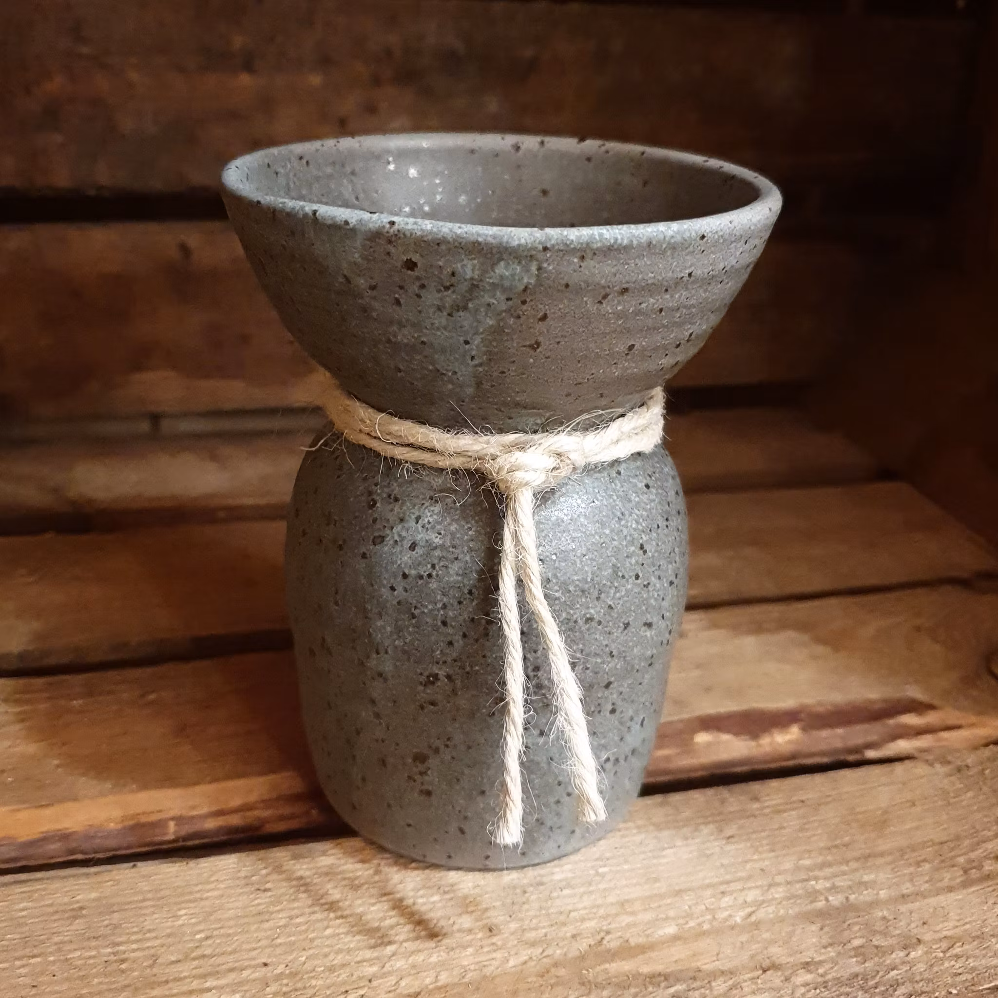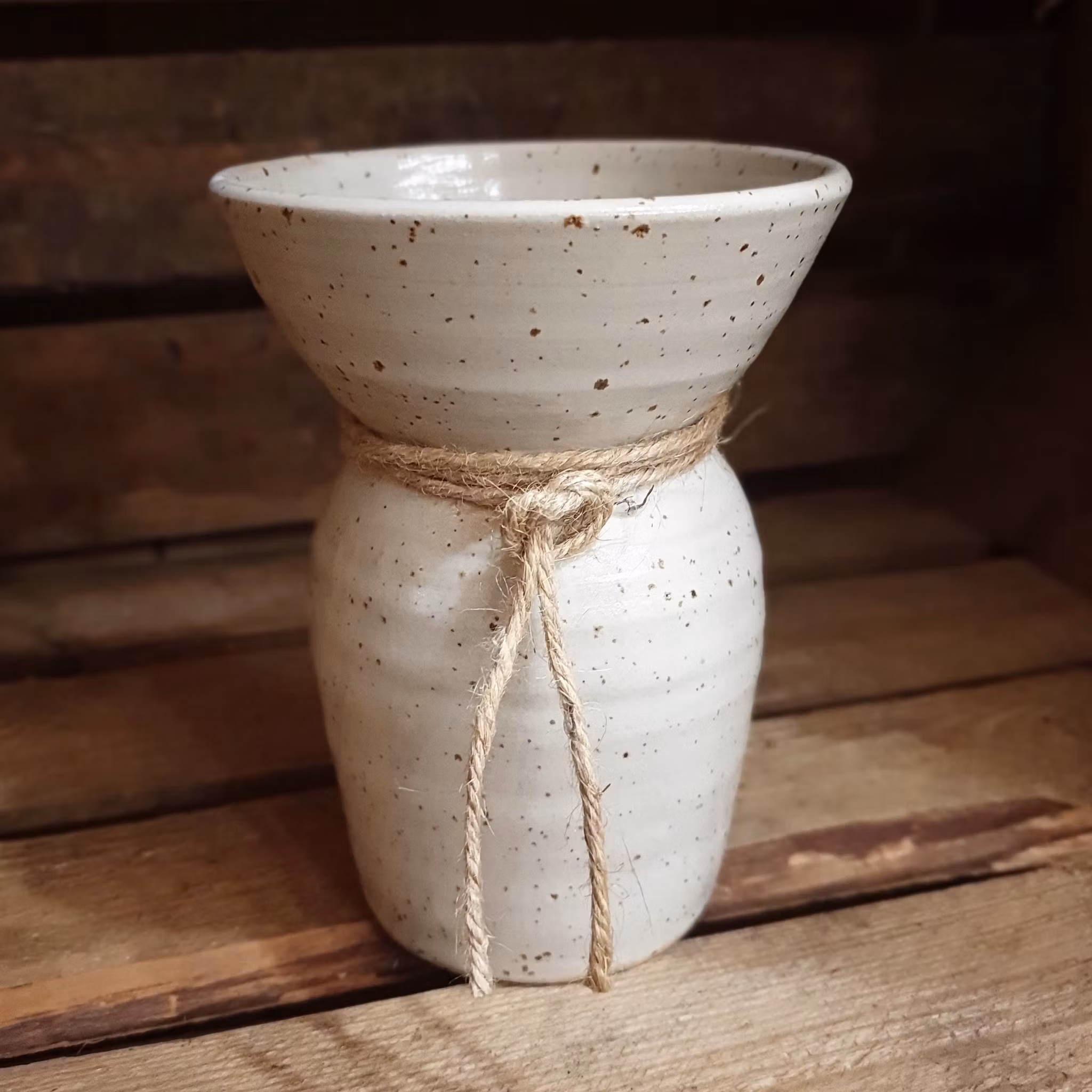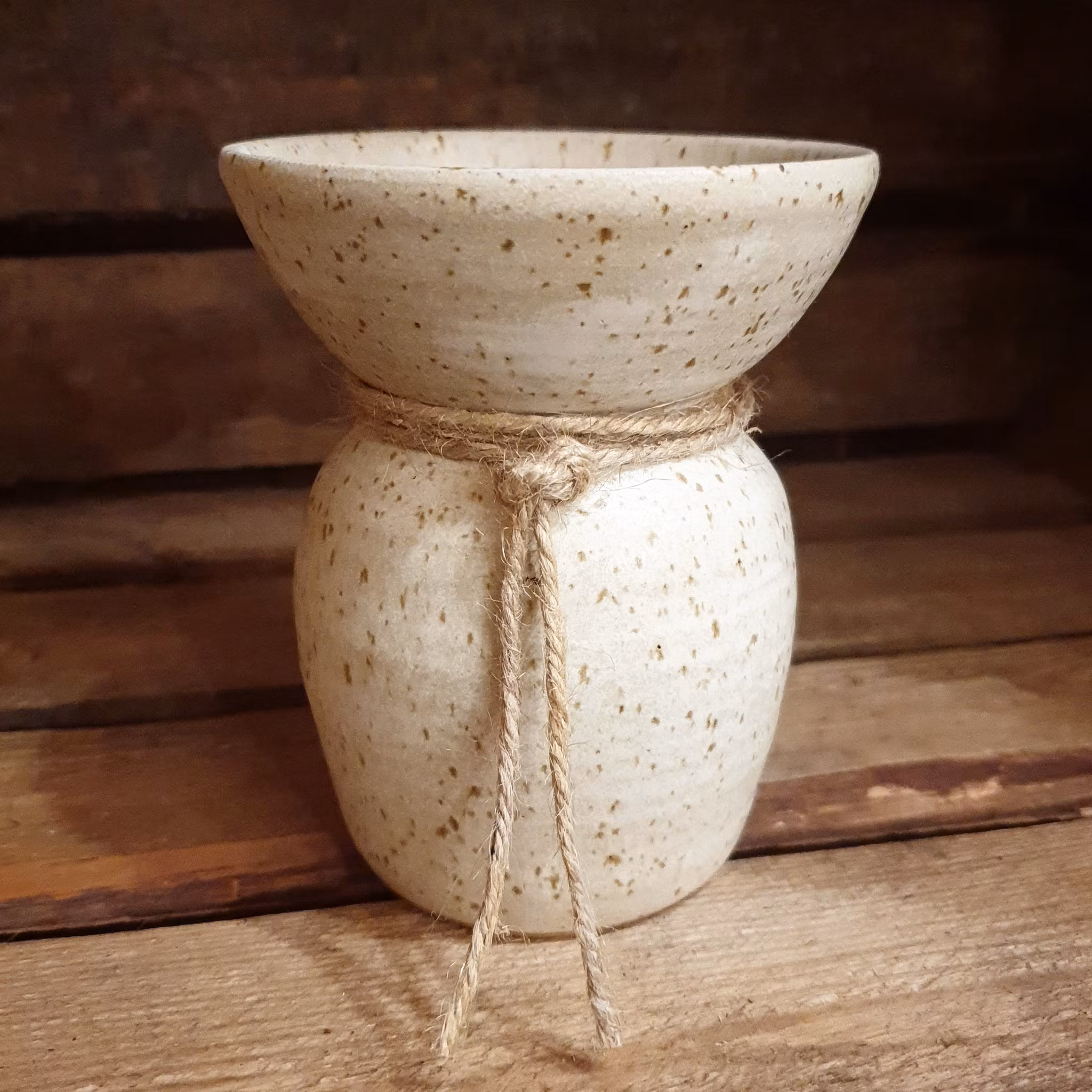 Drejad i lera med prickar av lava som ger en levande yta. Glaserad i matt eller halvmatt glasyr i vitt, beige, brunt och grått.