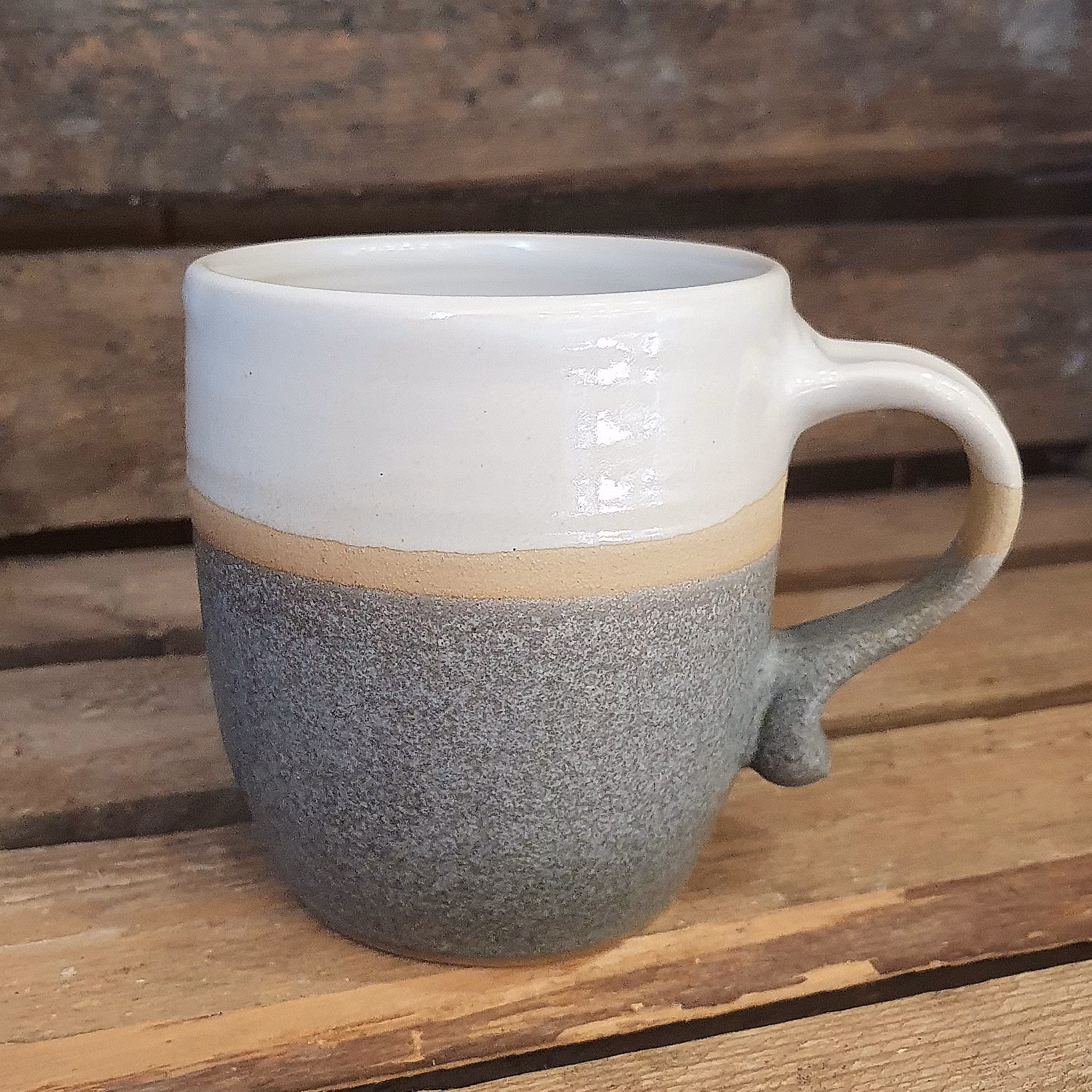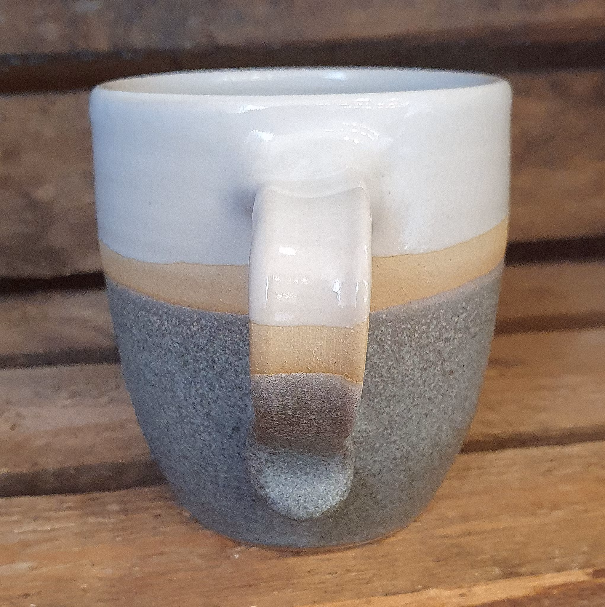 Lagom storlek för en liten god kopp kaffe och mysig att hålla i med matt grå glasyr, vit blank glasyr och däremellan en rand av oglaserad lera som ger en strävare yta. Örat har en liten klack där fingret kan vila som dessutom ger ett trevligt utseende.
