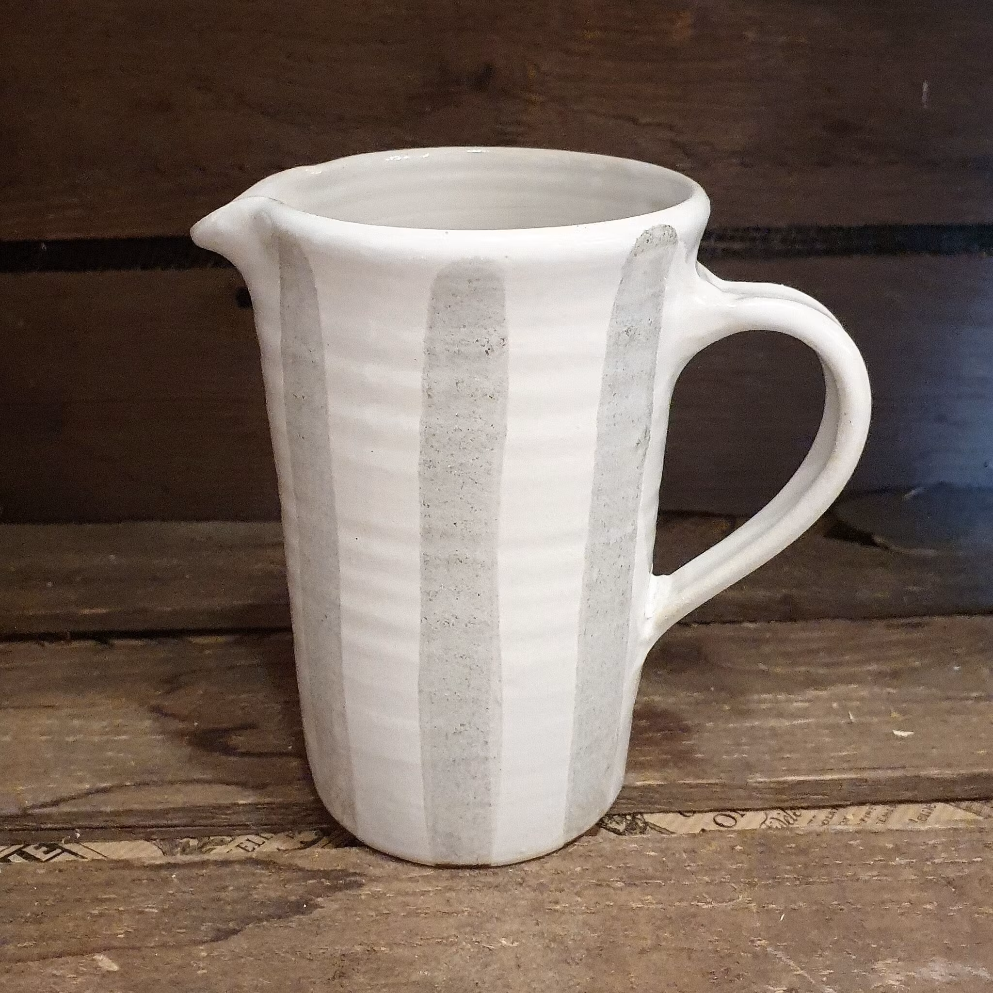 Drejad i ljus lera, dekorerad och glaserad i vit glasyr.