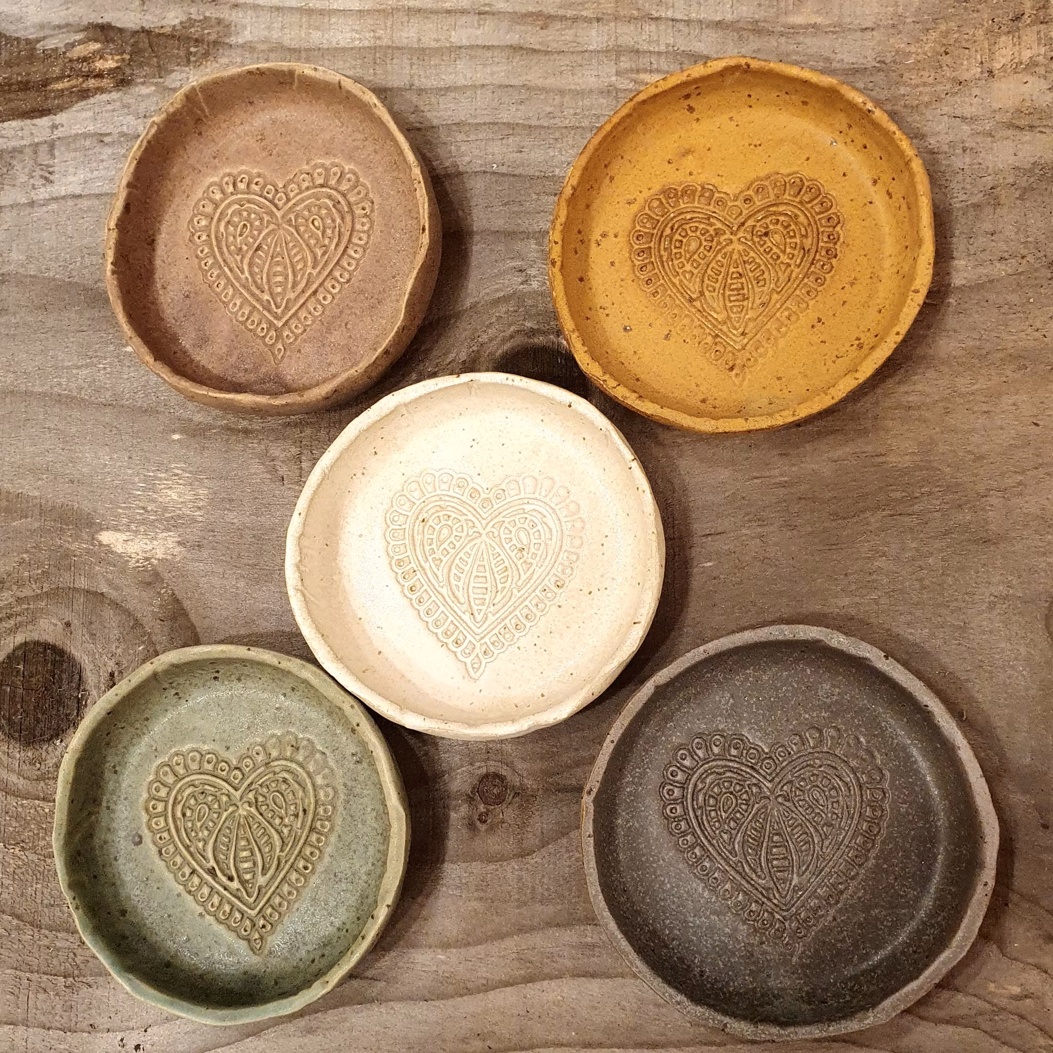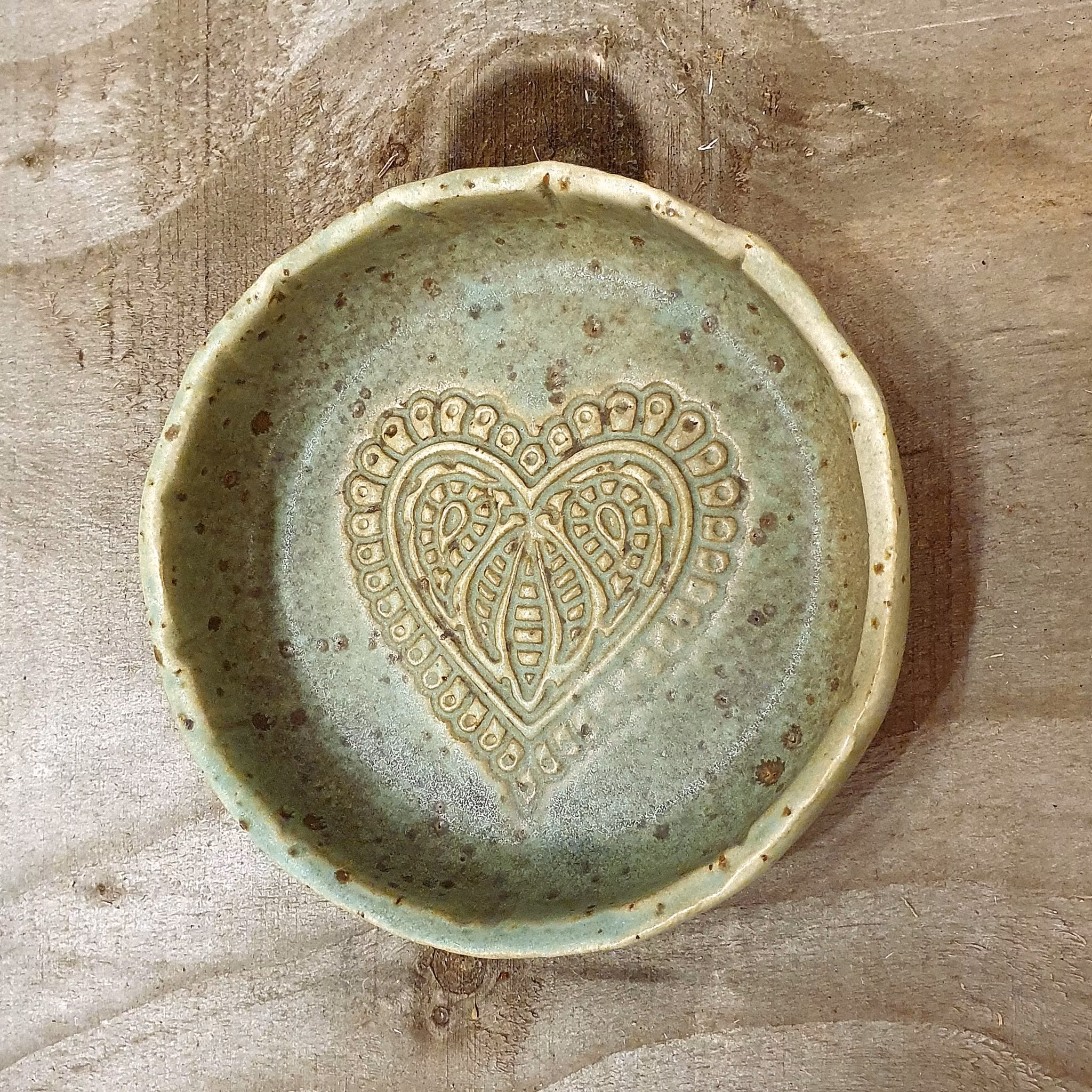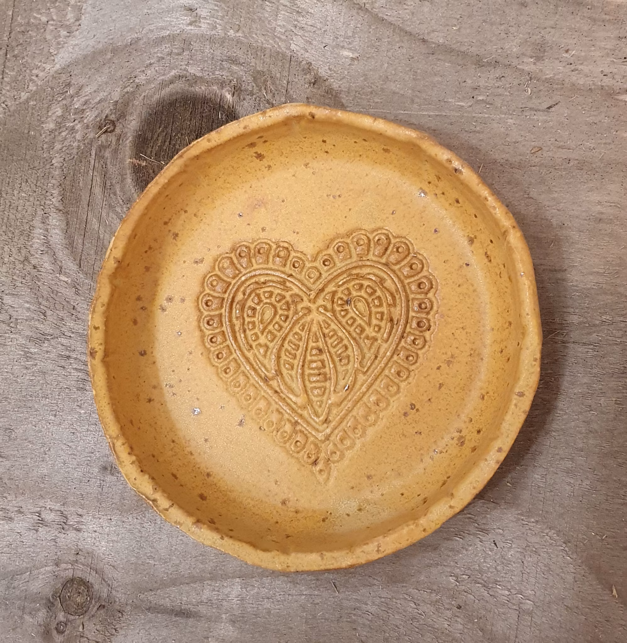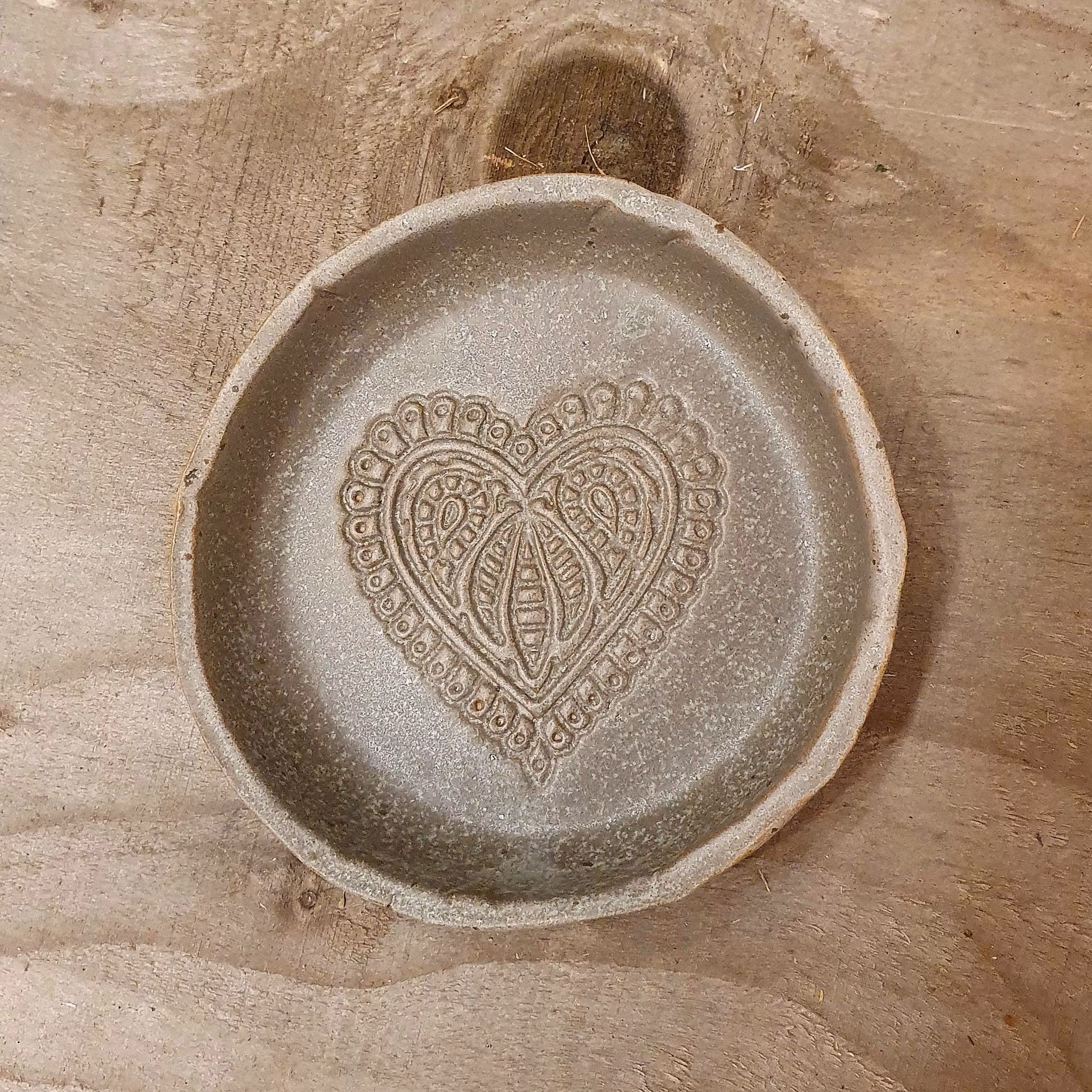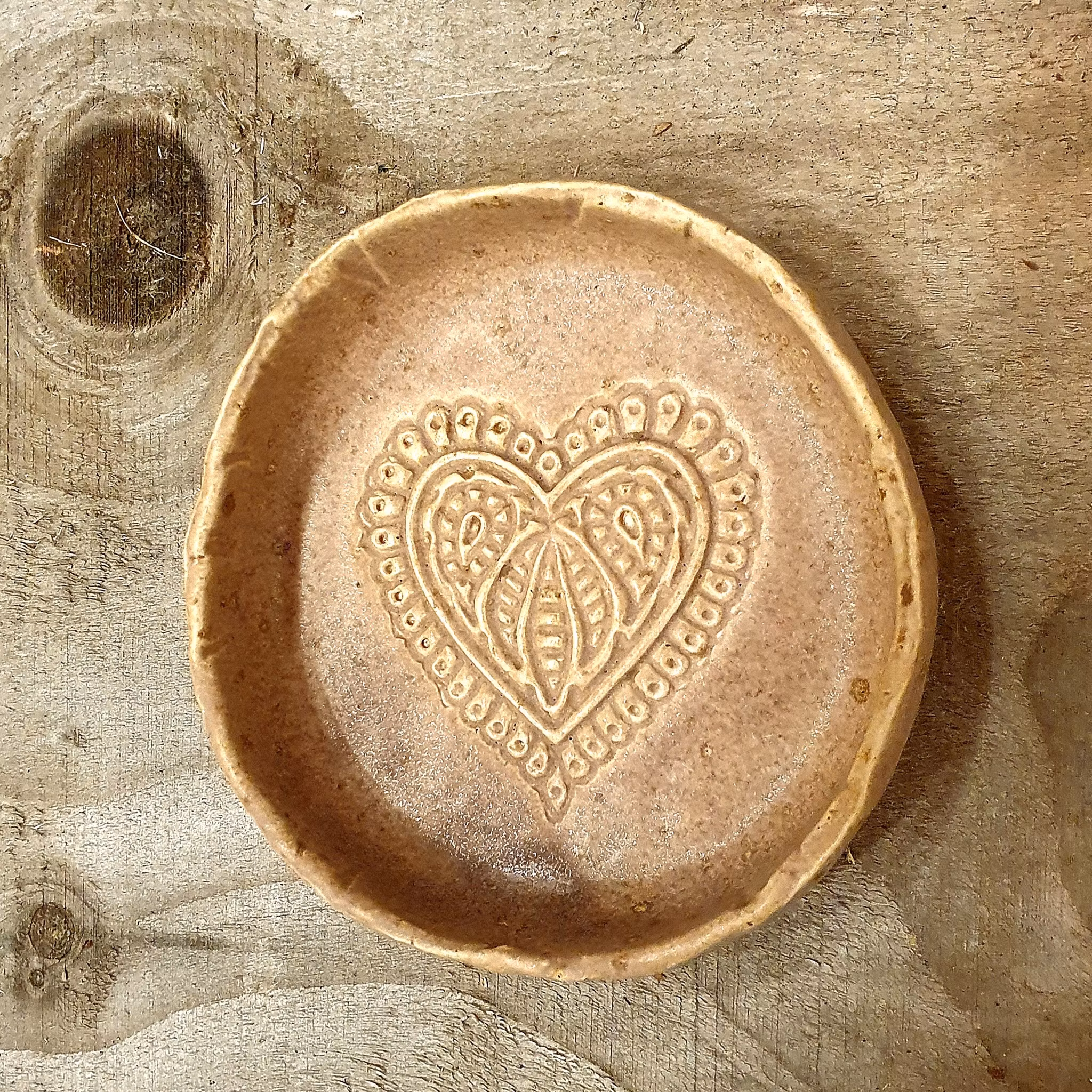 Kavlat i ljus lera med lavaprickar. Kanten något oregelbunden som ger en handgjord känsla. I mitten ett stort stämplat hjärta för extra finess.