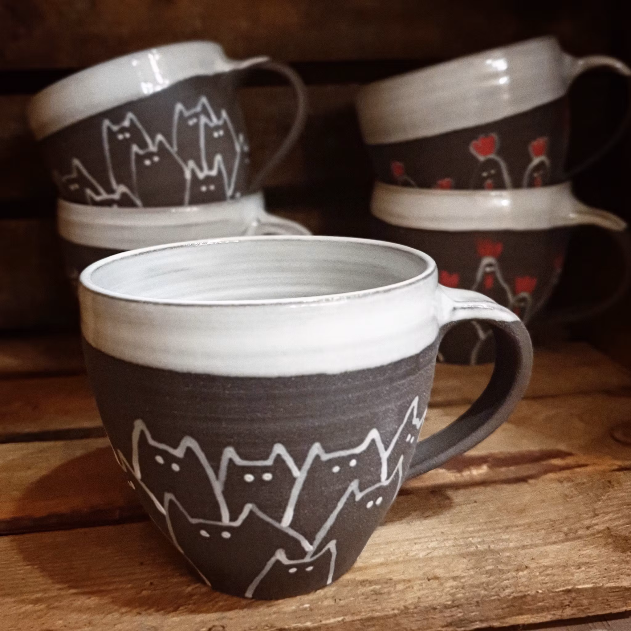 Stor mugg att kupa händerna runt till mysiga te-stunder. Utsidans mönster är handmålat direkt på muggen vilket gör varje mugg unik och kan skilja sig något från bilderna. Välj mellan tuffa katter eller coola hönor.